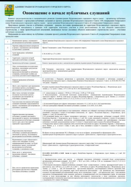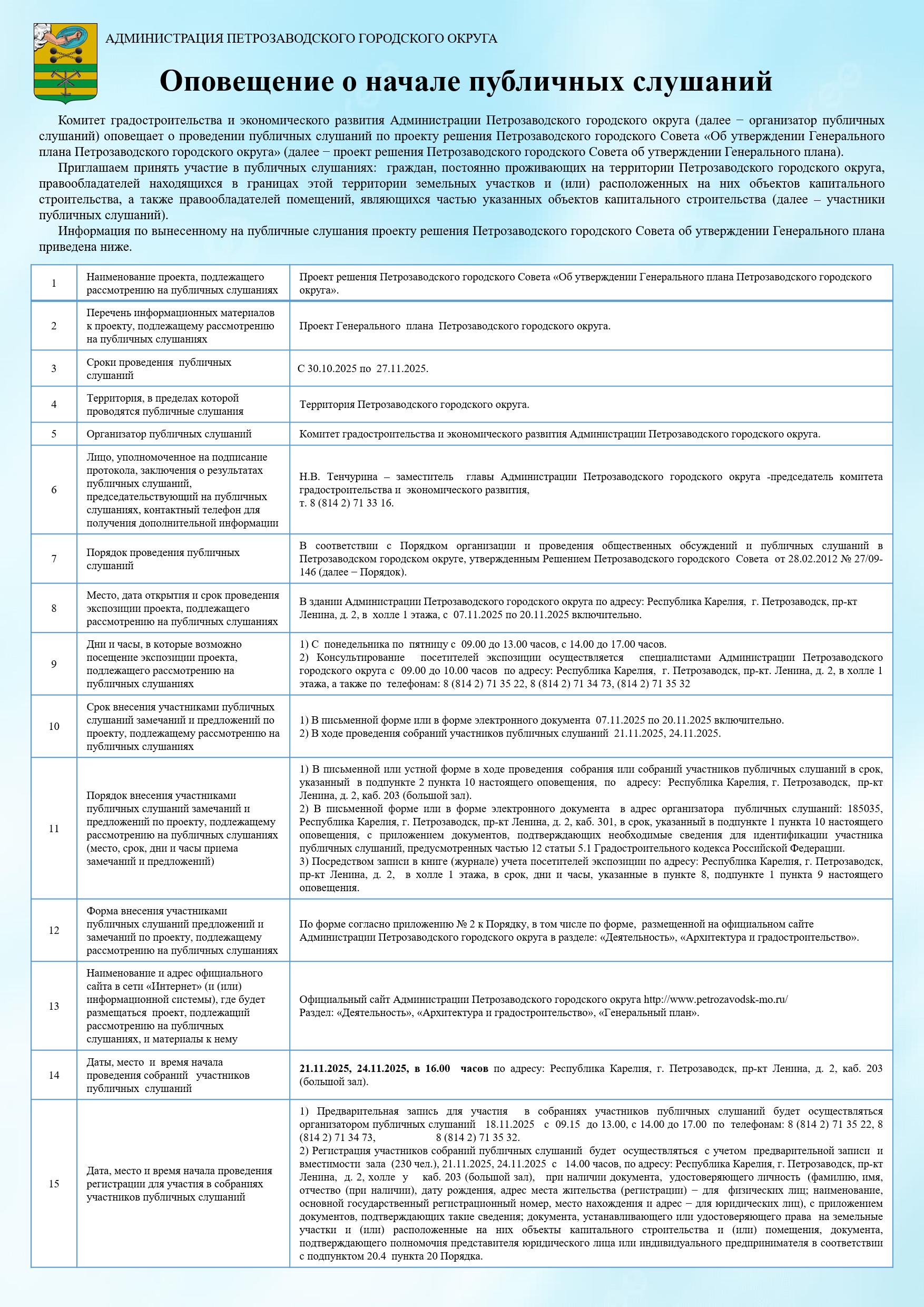 Комитет градостроительства и экономического развития Администрации Петрозаводского городского округа информирует о том, что постановлением Администрации от 30.10.2025 № 3093 «О проведении публичных слушаний» 21.11.2025 и 24.11.2025 назначены публичные слушания по проекту решения Петрозаводского городского Совета «Об утверждении Генерального плана Петрозаводского городского округа»